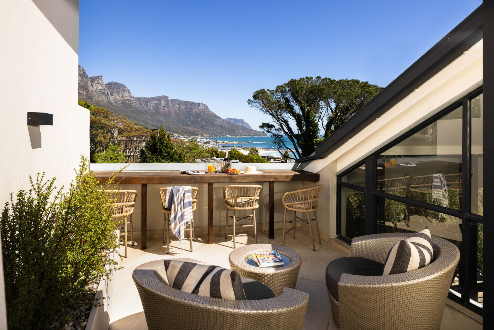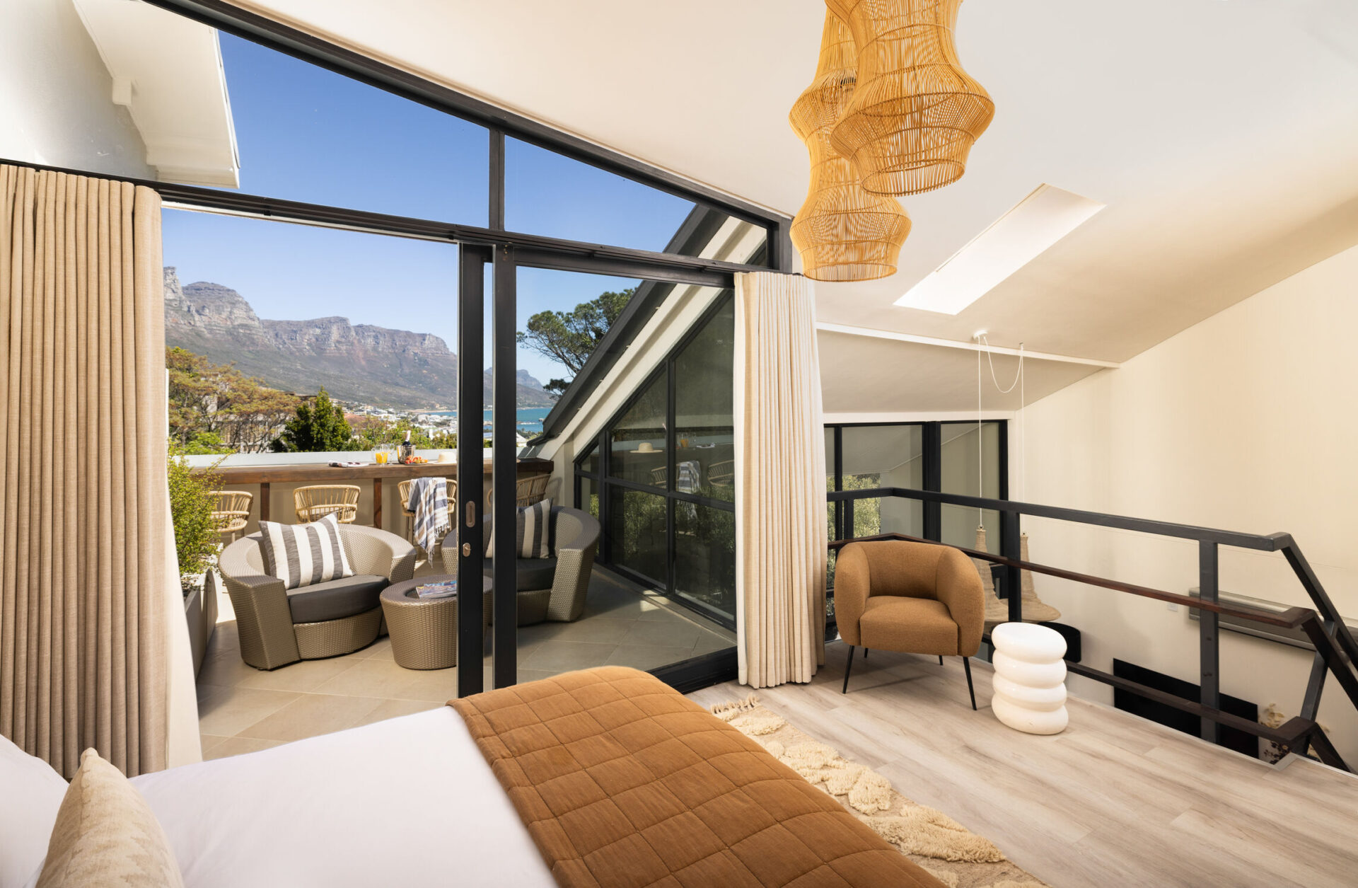 Villa 15 Ottawa, one of our cherished Camps Bay properties, has had a refreshing new makeover! Previously decorated in early 2010, it reflected the industrial chic decor style of the time: black leather and chrome finishes. In the post-pandemic era, guests desire a more natural and comforting space, so we decided to transform this property into exactly that. We have brought in soft, neutral, and earthy tones for a crisp and tranquil atmosphere. The contrasting textures of velvet, cotton, wicker and wood fuse beautifully, creating a plush and calming space to unravel in. Bursts of the surrounding seascape and sky flood the interiors, connecting you to nature so guests can destress and recharge in absolute serenity.