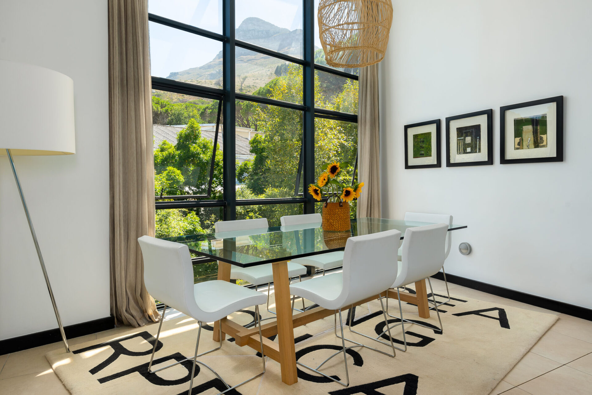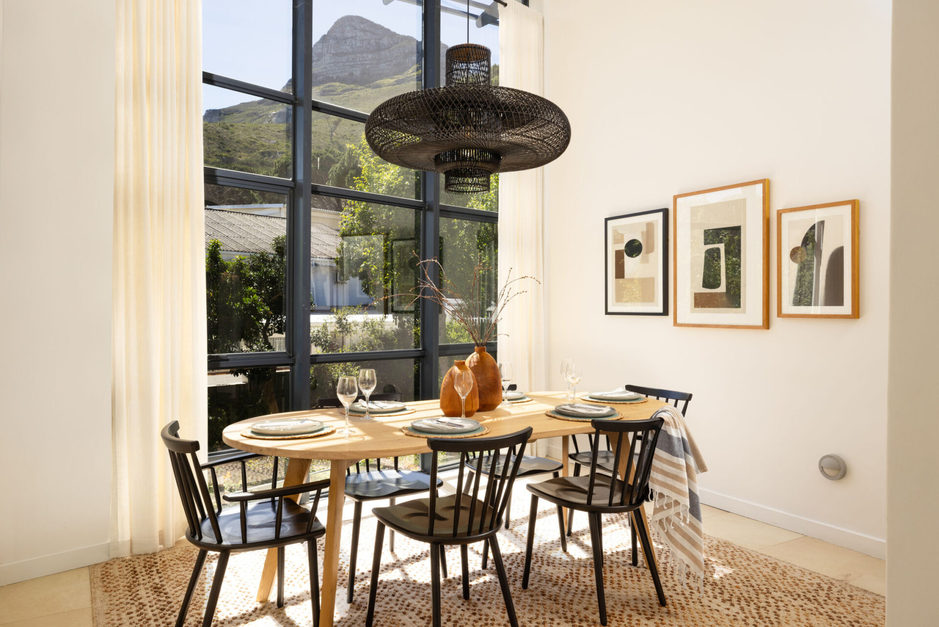 A slightly dated property with huge potential was bought by a french owner with a fine eye for quality and art, seeing the potential of the spacious residence with sea and mountain views. The brief was to recreate the traditional african bush lodge theme, to fuse with Scandinavian minimalism. He is a lover of african art, with a special focus on wildlife and birds. Only the finest quality in décor was taken up, and the owner loved us finding unique one-of-a-kind pieces for him.Expert decorator Elzabe Smit completely understood his brief to the last detail and was enthused by the final outcome. Renovations included repainting the entire villa, replacing some older carpets and knocking out the outside walls of the kitchen to make the space lush and green, bright and light.